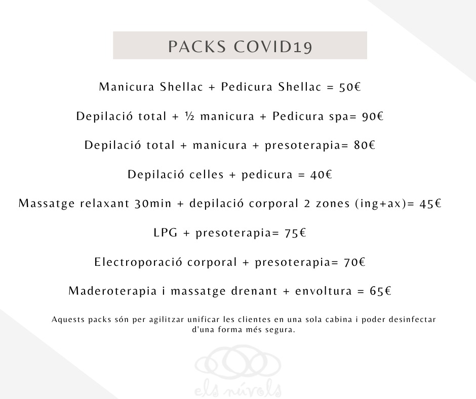 L’equip d’Els Núvols hem preparat uns packs de servei agrupant les possibles necessitats del client, essent així més àgils a l’hora de desinfectar. Els pots consultar aquí. A més, no us preocupeu que no quedarà cap persona amb un bonus de tractament (làser, LPGs, etc.) sense atendre. Tot i així, durant les dues primeres setmanes de reobertura, i sempre per garantir la seguretat de la clienta i del personal, no realitzarem serveis que requereixin que la clienta s’hagi de treure la mascareta. Aquests inclouen depilacions i higienes facials, entre d’altres.